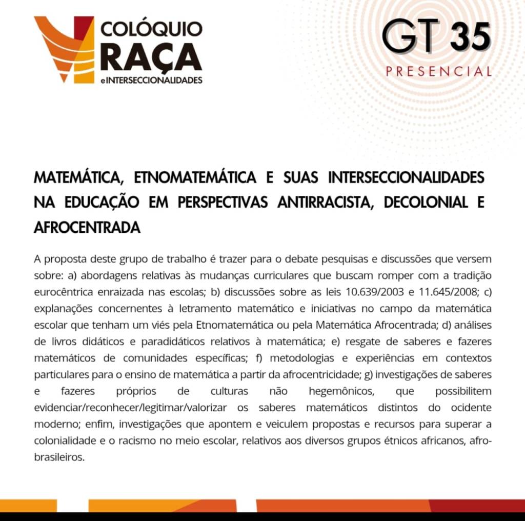 Tema: Matemática, Etnomatemática e suas interseccionalidades na Educação em perspectivas antirracista, decolonial e afrocentrada.