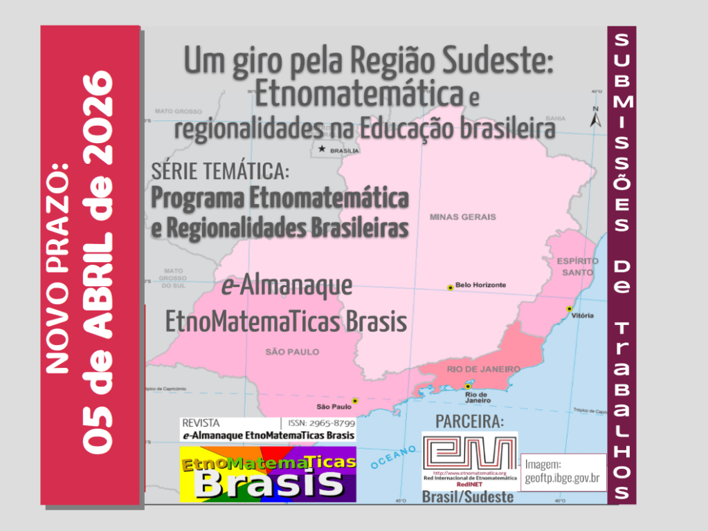 A Comunidade EtnoMatemaTicas Brasils, em parceria com a Red Internacional de Etnomatemática no Brasil (RedINET-Brasil), continua com chamada aberta para submissão de artigos para a Edição “Um giro pela Região Sudeste: Etnomatemática e regionalidades na Educação brasileira”, dando sequência à Série Temática “Programa Etnomatemática e Regionalidades Brasileiras”.